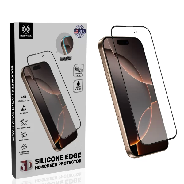 Maxwell 3D Silicone Edge HD Privacy Screen Protector Compatible with iPhone 16 Pro Crystal Clear, Anti-Static, Anti-Reflection, 0.33 mm Raised Protection, Easy to Install, Non Bubble Installation
